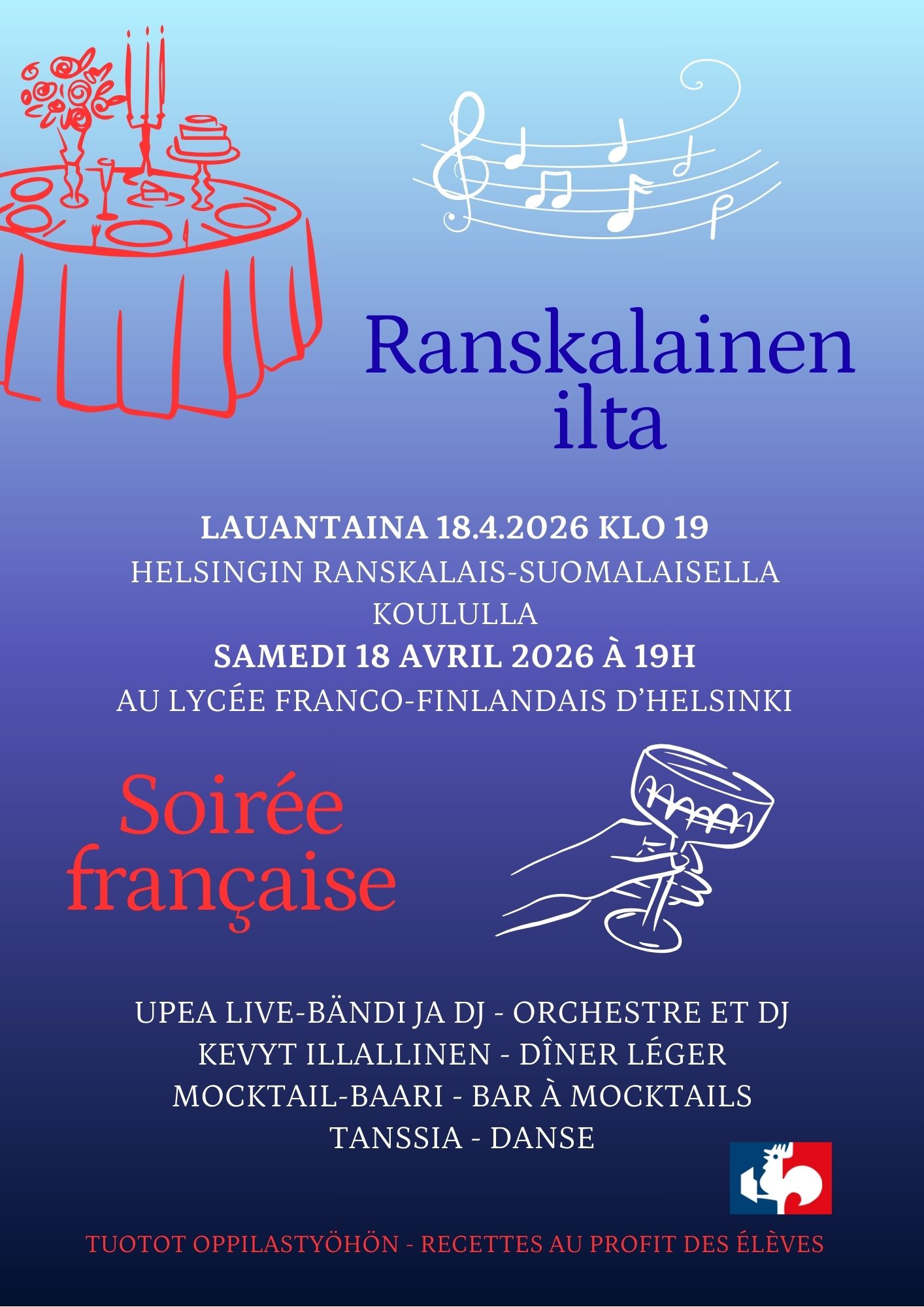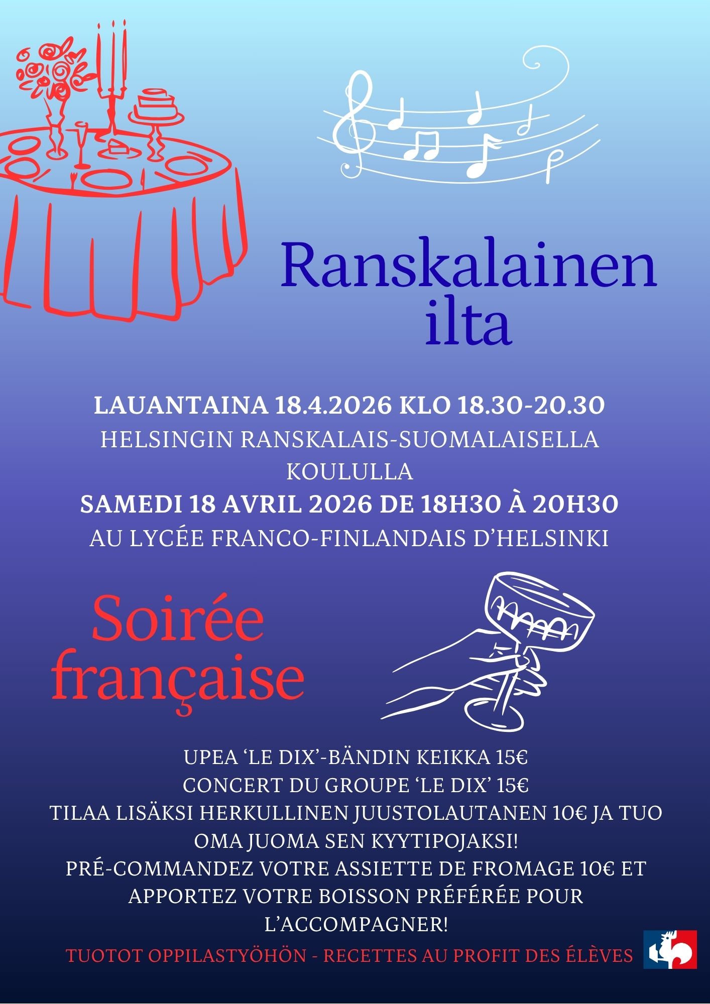 Lauantain 18.4.2026 ranskalaisen illan konsepti on elänyt – osallistuminen ja ja oppilastyön tukeminen ei ole koskaan ollut näin mukavaa ja mutkatonta!